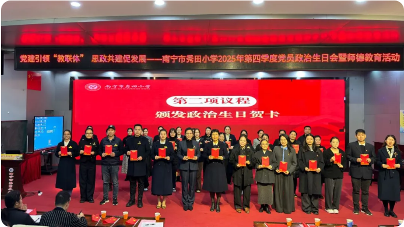 在庄重而温馨的政治生日庆祝环节,秀田小学党委书记韦艳蓉、校长黄静静共同为两校第四季度过政治生日的党员颁发政治生日贺卡、赠送党员徽章,激励他们永葆党员本色,践行育人担当。