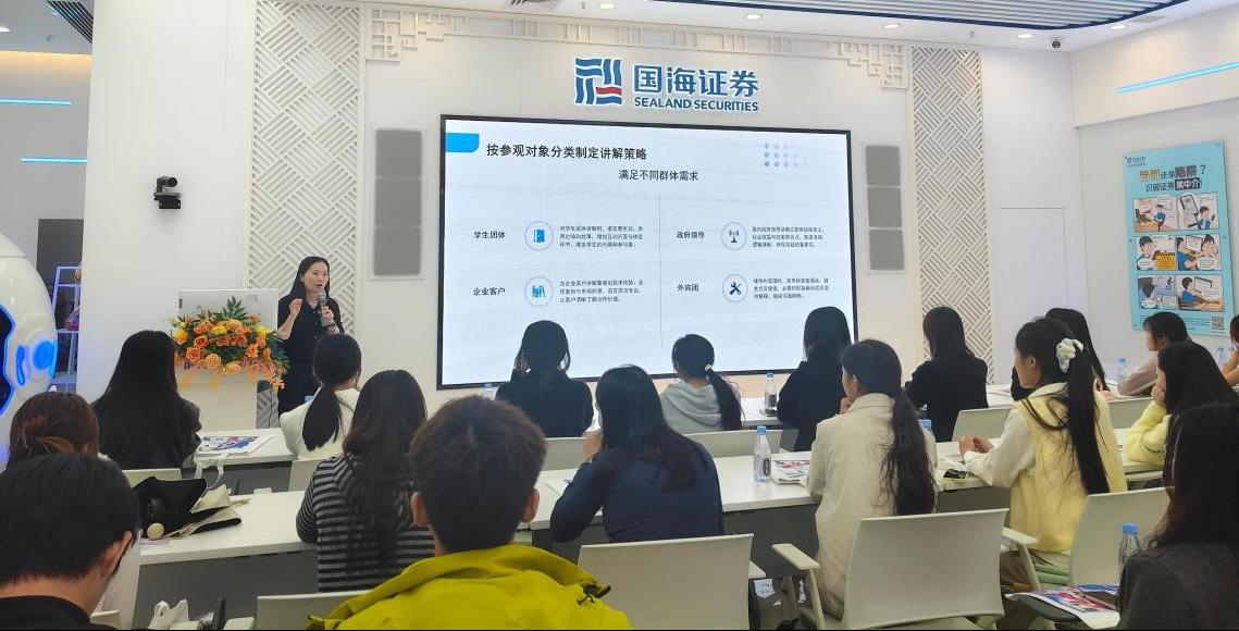 随后,国海证券投教基地负责人麻经理围绕 “投教基地讲解员技能要求” 进行专题分享,从专业知识储备、沟通表达能力、临场应变技巧等维度,详解优秀投教讲解员的核心素养,鼓励同学们积极报名参加学校投教宣讲团的活动。