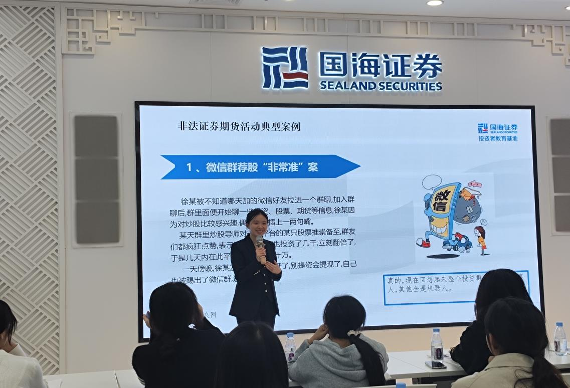 投教专员叶老师聚焦“投资金融反诈知识”,剖析“微信群荐股‘非常准’”等非法证券期货活动典型案例,揭露金融诈骗套路。她结合案例讲解识别、防范金融诈骗的方法,提醒大家在投资中保持理性,警惕 “高收益陷阱”,守护财产安全。